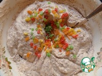 Мелко нарезать цукаты. Я использовала ананасы. Кол-во на вкус. Перемешать. |