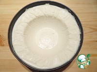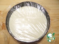 Выливаю творожную массу в форму с основой, сверху накрываю форму пленкой. |