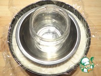На пленку помещаю миску, а в нее банку. В банку добавляю столько холодной воды, чтобы дно миски немного не доходило до основы. Убираю форму в холодильник до застывания творожного слоя. |