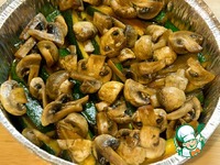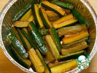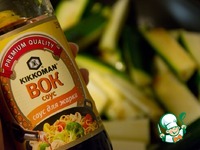Цукини нарезать продольными кусочками. Обжарить на масле с добавлением соевого соуса для жарки. Он имеет сладковатый вкус — то, что надо. |