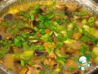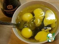 Приготовим омлет. Смешать яйца, сахарную пудру, воду, соевый соус. Если от грибов осталась жидкость — можно добавить. |