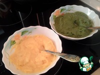 В оставшееся молоко добавляем шафран. Оно приобретает желто-розовый цвет. Пюре делим на две равные части и одну смешиваем со шпинатом, а вторую с молоком с шафраном. |