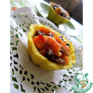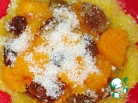 Сверху вишен ложем тыкву с изюмом и присыпаем все сахаром. Отправляем в разогретую до 180 градусов духовку на 7-10 минут. |