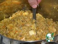 Засыпаем рис и распределяем его так, чтобы он равномерно погрузился в зирвак. |