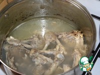 В кастрюлю заливаем 1300 мл воды и помещаем туда кости от курицы. Ставим варить на 30 минут. (Примечание - соль не добавлять!) |