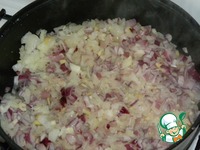 К обжаренному луку добавляем мясо и тушим под крышкой до полуготовности. |