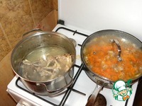 Бульон от куриных костей переливаем в эту кастрюлю. Если бульона меньше, чем 1250 мл, то недостаток восполняем водой. |
