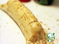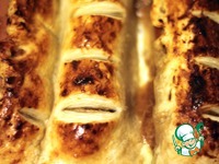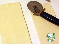 Для приготовления этого блюда слоеное тесто нужно разморозить, чуть-чуть раскатать и разрезать пополам. |