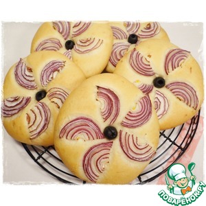 Беру один шар из теста, раскатываю с помощью скалки лепешку до толщины около 1 см. В серединку вдавливаю маслину, украшаю полукольцами красного лука. Таким же образом формую остальные лепешки. |