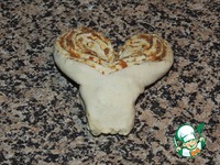 Голову барашка сделать из большой плюшки. Для этого половину одной пластины теста раскатать до увеличения площади примерно вдвое. Разложить 1/4 часть начинки. |
