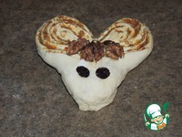 Застелить противень бумагой для выпечки. Переложить на нее плюшку и сформировать из нее мордочку барашка (глаза из изюма, чубчик из орехов). |