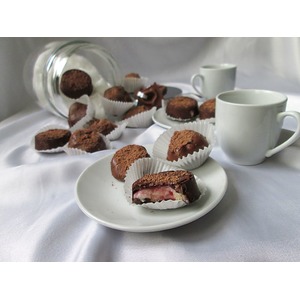 Остаток растопленного шоколада наносим на творожную начинку, ставим формочку в холодильник. Первый вариант конфет готов. |