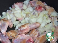 Крылышки помыть, почистить и обжарить немного в небольшом количестве оливкового масла. Добавить почищенный и нарезанный, четвертинками лук. |