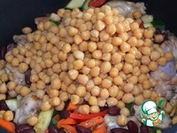 Заранее отваренный нут. Перемешать, потушить всё вместе минут 5, на среднем огне. |