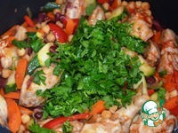 Залить всё пассерованными томатами, посолить, поперчить, добавить специи, зелень и чеснок, выдавленный через пресс. Варить, ещё в течении 25 минут или до готовности! |