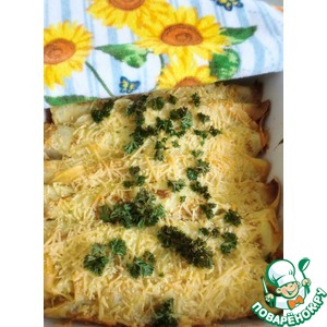 Блинчики сложить в глубокую огнеупорную посуду, предварительно смазанную маслом. Посыпать пармезаном, отправить в разогретую до 180 духовку. Выпекать 5-10 минут или до зарумянивания сыра |