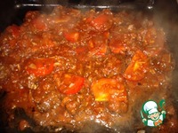 Вылить соус в противень с суджукакья, стараясь распределить его равномерно. Запекаем в духовом шкафу при 200' 20-25 мин. |