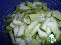 Почистить. Порезать на небольшие кусочки и их разрезать вдоль. Уложить в друшлаг, который поставить на тарелку. |