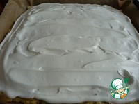 Через 20 мин., на горячий пирог выложить безе произвольно. Если выложить с помощью кулинарного шприца, будет красиво и празднично. |