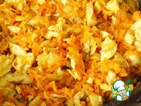 1. В сковороде разогреть масло. Лук нарезать кубиком, морковь натереть на крупной терке. Курицу нарезать на кусочки. |
