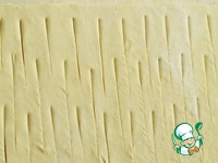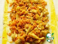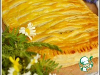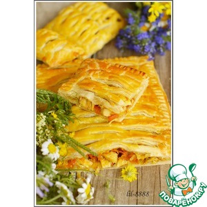5. На втором прямоугольнике сделать надрезы. Накрыть начинку вторым прямоугольником, защипать края. Примерно так же сделать слойки. Выложить на противень. |