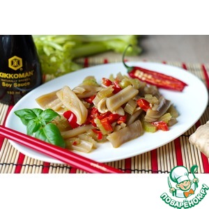 Добавляем кальмаров, соевый соус и сахар, готовим на сильном огне 2-3 минуты. |