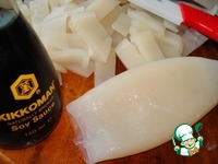 У меня было чищенное филе кальмара, острым ножом с одной стороны сделать надрезы в виде решётки ( не прорезая филе до конца). Нарезать филе кусочками длиной 3–4 см. |