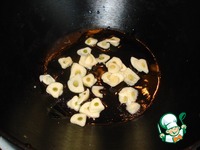 Чеснок режем тонкими пластинками. На сковороде или воке разогреваем растительное масло, обжариваем чеснок до лёгкого золотистого цвета. |