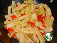Добавляем овощи, вливаем 120 мл воды, доводим до кипения, провариваем 2 минуты. |