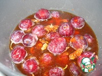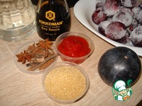 В кастрюлю с толстыми стенками нальем воду 0,5 стакана, добавим сливы, уксус, 3 ст. ложки соевого соуса, сахар, соус чили, бадьян, палочку корицы. |