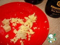 В небольшой кастрюльке смешаем шампанское, имбирь, чеснок, сахар 1 ч. ложку и добавляем 2 ст. ложки соевого соуса. |