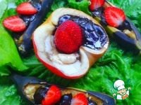 Как только шоколад начнет подтаивать, яблоки снимаем с мангала и кладем клубнику. |