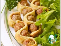 2. Тесто раскатать в прямоугольник. Нарезать полосками, шириной чуть больше диаметра фрикаделек. |