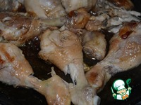 Выкладываем маринованные голени на сковороду с растительным маслом и обжариваем до румянца. Добавляем к голеням маринад и тушим до готовности под крышкой. |