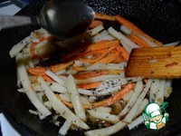 Обжариваем морковь и картофель сначала на масле, а потом добавляем 2ст. л. соевого соуса, базилик и молотый имбирь. |