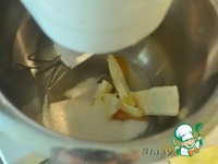 Смешать масло комнатной температуры, сахар, ванилин и яйца до однородной массы. |