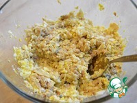 Откройте банку с консервированным тунцом, переложите содержимое в мисочку. Разомните вилкой. Добавьте соевый соус ТМ «Киккоман». |