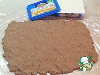 Подготовленный фарш выложите на пищевую пленку и разровняйте (должен получится прямоугольный пласт). |
