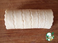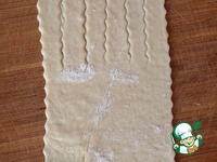 Каждую часть тонко раскатать, примерно толщиной 3-4 мм. Вырезать прямоугольники, размером 10х18 см. На одной половинке прямоугольника сделать надрезы. |