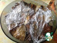 Начинку укрываем лепестками баклажан. И накрываем пленкой. Сверху кладем небольшой гнет и отправляем на 1,5 часа в холодильник. |