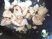 Добавить к луку мелко нарезанное куриное филе, уменьшить огонь и, помешивая, довести до полуготовности. |