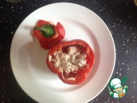 Перец заполнить начинкой : мелко нарезанные помидоры, филе с луком и сверху намазать творожным сыром. |