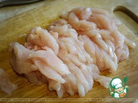 Нарезать тонкими прямоугольными кусочками куриное филе. |