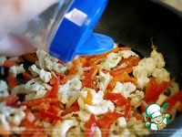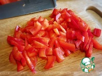 Нарезать сладкий перец соломкой и добавить его в сковороду к остальным продуктам. |