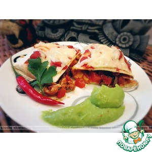 Подавать на тарелке с соусом гуакамоле, по желанию с соусом сальсой. Можно полить немного сверху сметаной. |