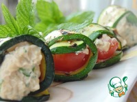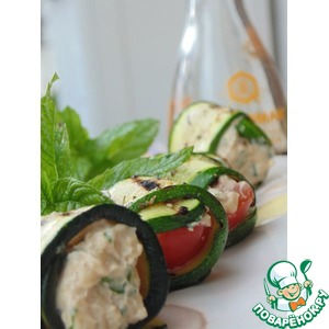 Собрать рулетики: на каждую пластинку кабачка положить 1 ч. л. сырной начинки и кусочек помидора, завернуть в рулетики. Охладить в холодильнике. |