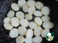Картофель очищаем от кожуры, режем на кругляшки, немного солим, сбрызгиваем растительным маслом. |