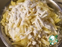 Аккуратно перемешиваем, чтобы крахмал покрыл все брусочки. НЕ СОЛИМ, иначе картофель будет отдавать влагу и при жарке не получится аппетитной корочки. |