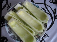 Кабачки чистим, моем и вынимаем сердцевинки чайной ложечкой, получаются вот такие лодочки, которые немного присаливаем, чтобы пустили сок |