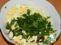 Яйца варим и мелко режем. Измельчаем зелень и добавляем все к грибам. Солим, перчим, перемешиваем. |